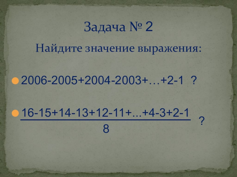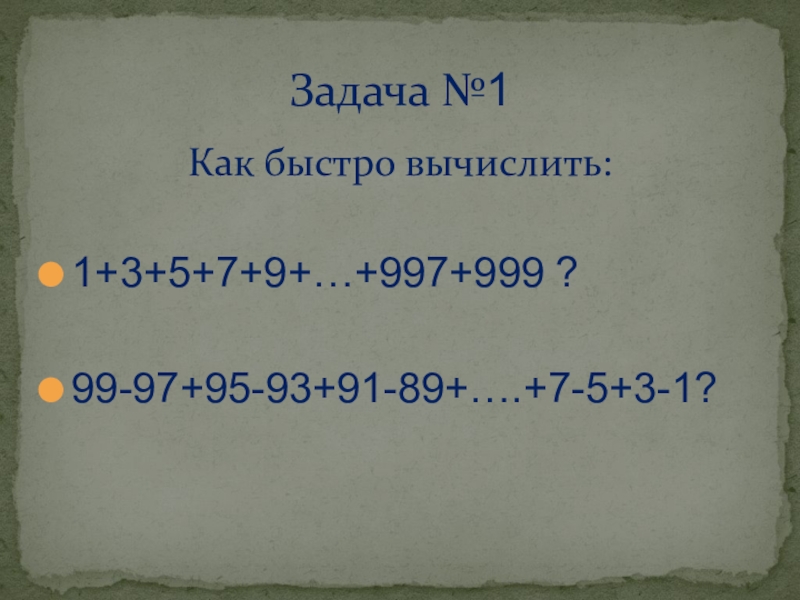 Как быстро вычислить:1+3+5+7+9+…+997+999 ?99-97+95-93+91-89+….+7-5+3-1?Задача №1