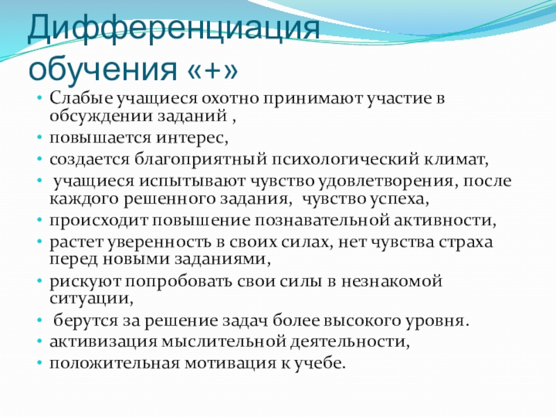 и на основе этого рассматривать и применять формы и методы дифференцированного обучения, то это позволит повысить качество знаний учащихся.