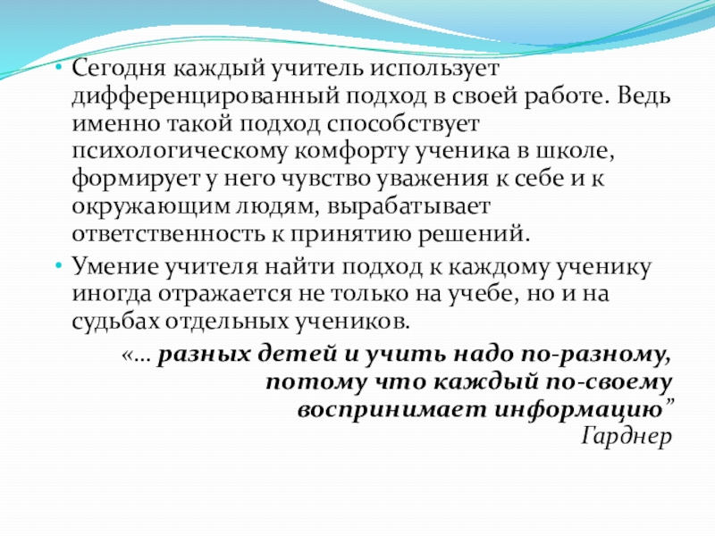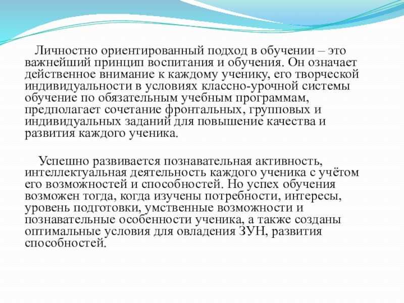 воспитания и обучения. Он означает действенное внимание к каждому ученику, его творческой индивидуальности в условиях классно-урочной системы обучение по обязательным учебным программам, предполагает сочетание фронтальных, групповых и индивидуальных заданий для повышение качества и развития каждого ученика.