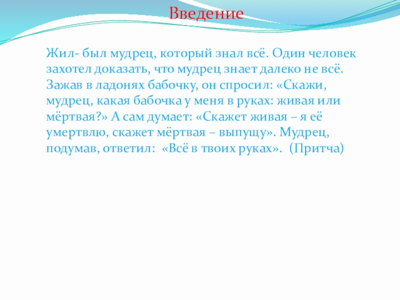мудрец знает далеко не всё. Зажав в ладонях бабочку, он спросил: «Скажи, мудрец, какая бабочка у меня в руках: живая или мёртвая?» А сам думает: «Скажет живая – я её умертвлю, скажет мёртвая – выпущу». Мудрец, подумав, ответил: «Всё в твоих руках». (Притча)