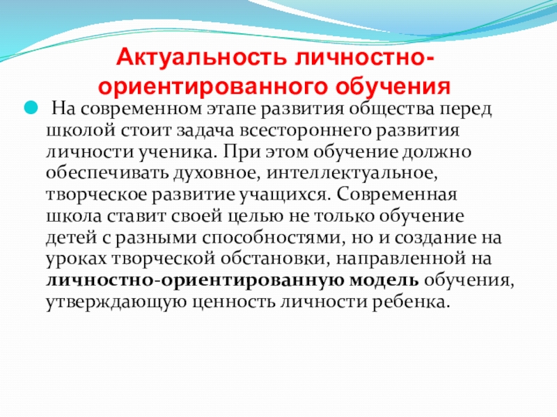 школой стоит задача всестороннего развития личности ученика. При этом обучение должно обеспечивать духовное, интеллектуальное, творческое развитие учащихся. Современная школа ставит своей целью не только обучение детей с разными способностями, но и создание на уроках творческой обстановки, направленной на личностно-ориентированную модель обучения, утверждающую ценность личности ребенка.