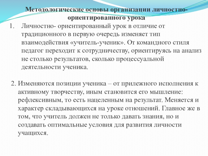 Слайд 8Методологические основы организации личностно-ориентированного урока