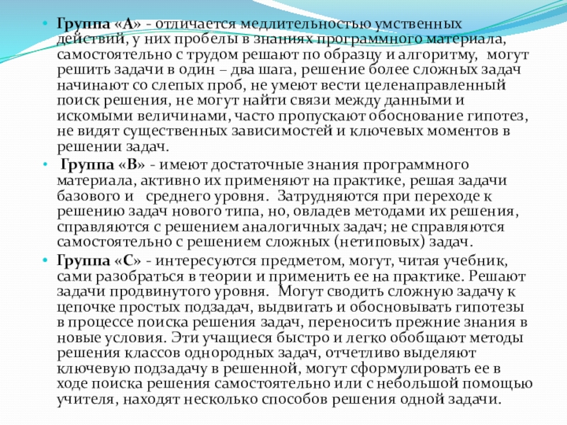 Слайд 17Группа «А» - отличается медлительностью умственных действий, у них пробелы в