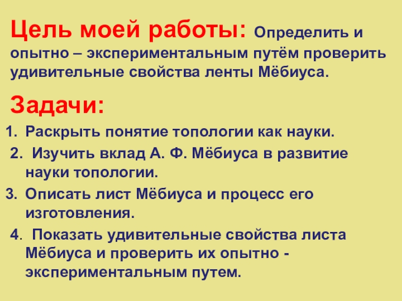 2. Изучить вклад А. Ф. Мёбиуса в развитие науки топологии.