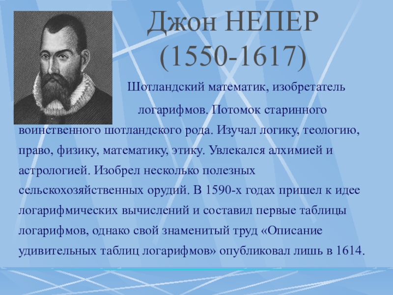 логарифмов. Потомок старинного воинственного шотландского рода. Изучал логику, теологию, право, физику, математику, этику. Увлекался алхимией и астрологией. Изобрел несколько полезных сельскохозяйственных орудий. В 1590-х годах пришел к идее логарифмических вычислений и составил первые таблицы логарифмов, однако свой знаменитый труд «Описание удивительных таблиц логарифмов» опубликовал лишь в 1614.