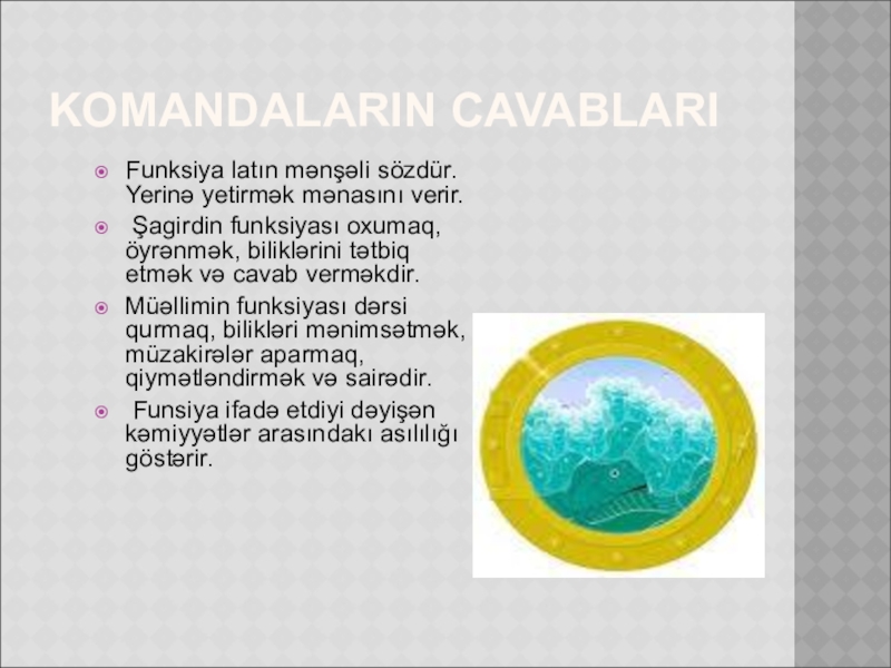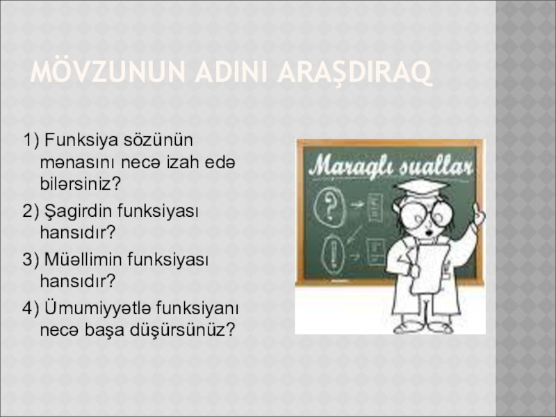 Müəllimin funksiyası dərsi qurmaq, bilikləri mənimsətmək, müzakirələr aparmaq, qiymətləndirmək və sairədir.