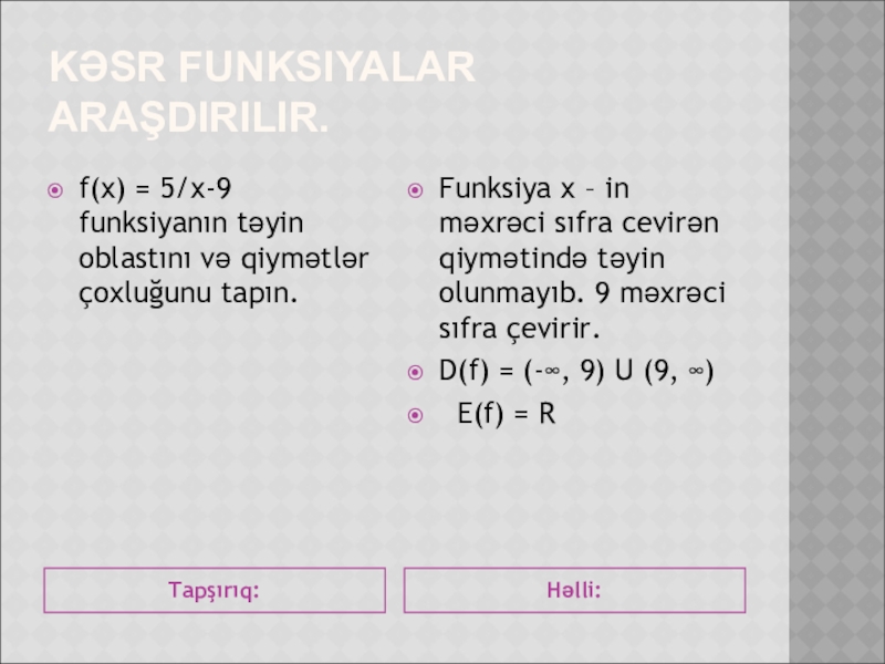 Funksiya x – in məxrəci sıfra cevirən qiymətində təyin olunmayıb. 9 məxrəci sıfra çevirir.