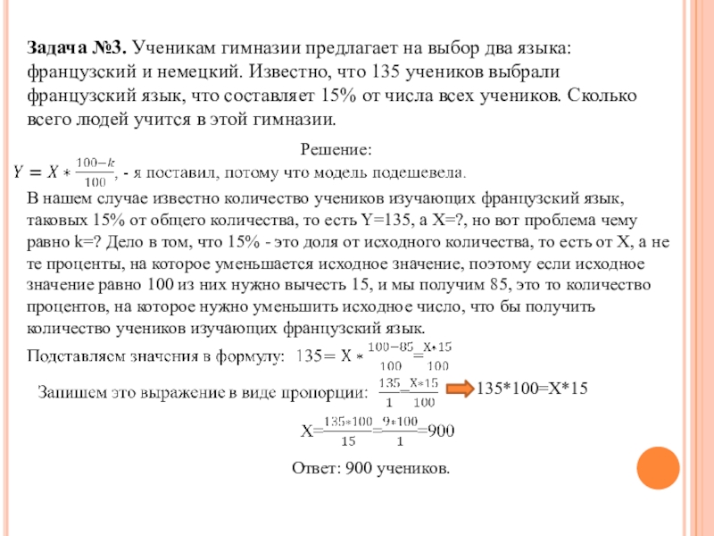 В нашем случае известно количество учеников изучающих французский язык, таковых 15% от общего количества, то есть Y=135, а X=?, но вот проблема чему равно k=? Дело в том, что 15% - это доля от исходного количества, то есть от Х, а не те проценты, на которое уменьшается исходное значение, поэтому если исходное значение равно 100 из них нужно вычесть 15, и мы получим 85, это то количество процентов, на которое нужно уменьшить исходное число, что бы получить количество учеников изучающих французский язык.