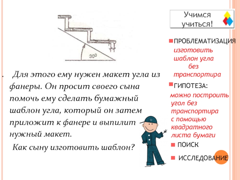 . Для этого ему нужен макет угла из фанеры. Он просит своего сына помочь ему сделать бумажный шаблон угла, который он затем приложит к фанере и выпилит нужный макет.