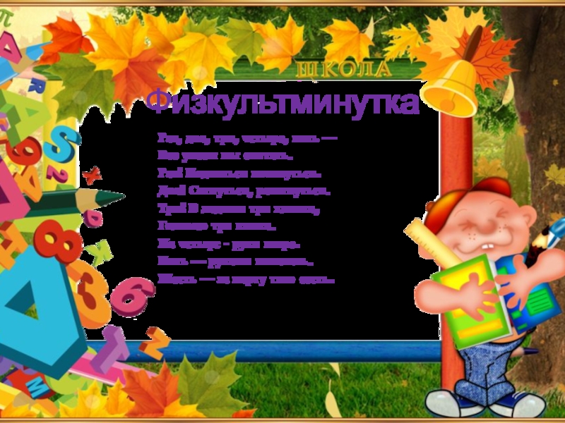 ФизкультминуткаРаз, два, три, четыре, пять —Все умеем мы считать.Раз! Подняться потянуться. Два! Согнуться, разогнуться. Три! В ладоши