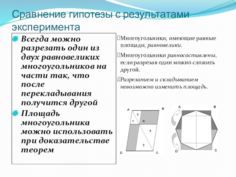 Метод «разрезания и складывания» годится для любых равных по площади многоугольников: всегда можно разрезать один из них на части так, что после перекладывания получится другой, (такие многоугольники называются равносоставленными).