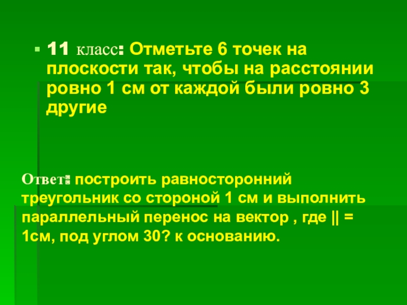 11 класс: Отметьте 6 точек на плоскости так, чтобы на расстоянии ровно 1 см от каждой были ровно 3 другие