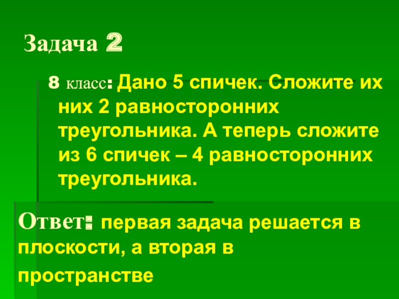 Ответ: первая задача решается в плоскости, а вторая в пространстве