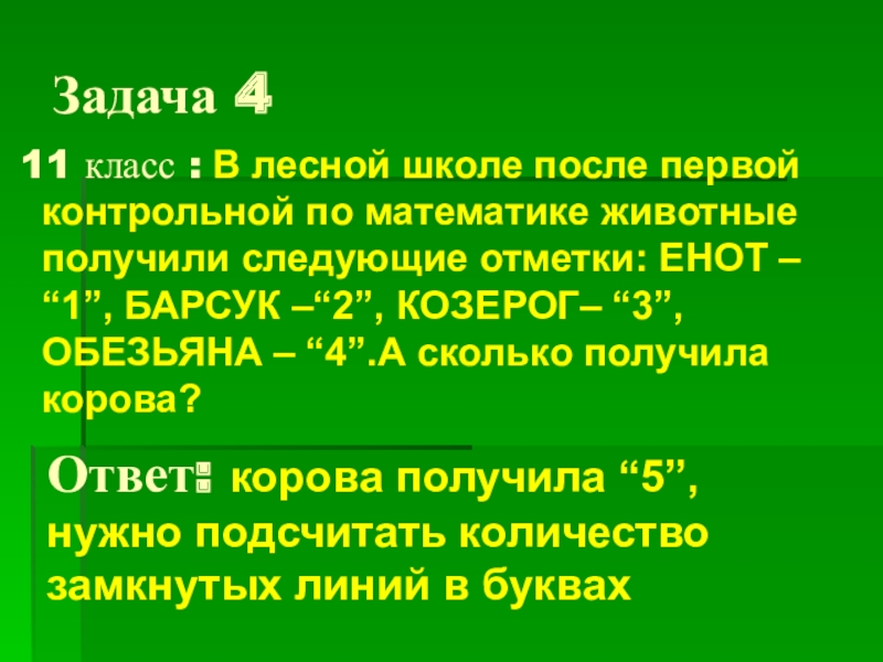 Ответ: корова получила “5”, нужно подсчитать количество замкнутых линий в буквах