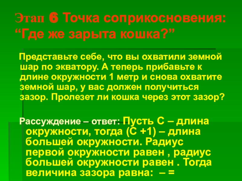 Рассуждение – ответ: Пусть С – длина окружности, тогда (С +1) – длина большей окружности. Радиус первой окружности равен , радиус большей окружности равен . Тогда величина зазора равна: – =