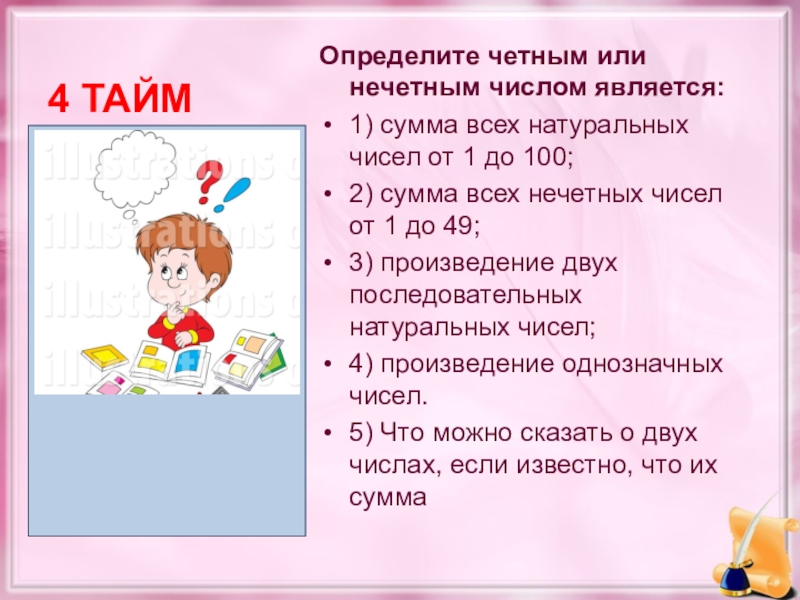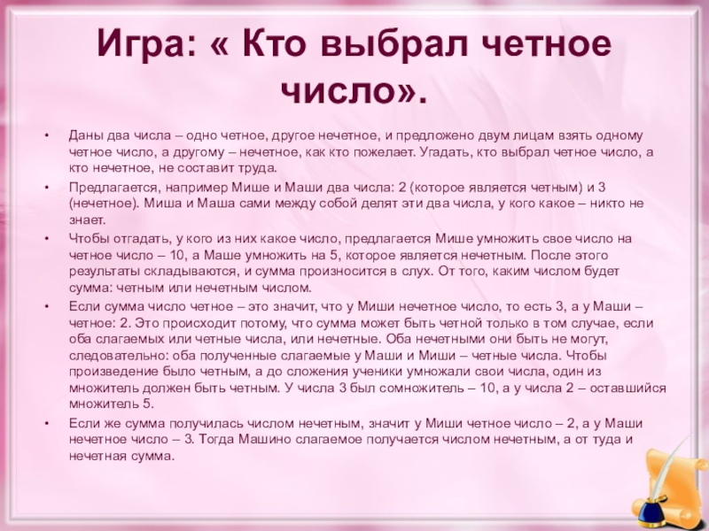 Чтобы отгадать, у кого из них какое число, предлагается Мише умножить свое число на четное число – 10, а Маше умножить на 5, которое является нечетным. После этого результаты складываются, и сумма произносится в слух. От того, каким числом будет сумма: четным или нечетным числом.