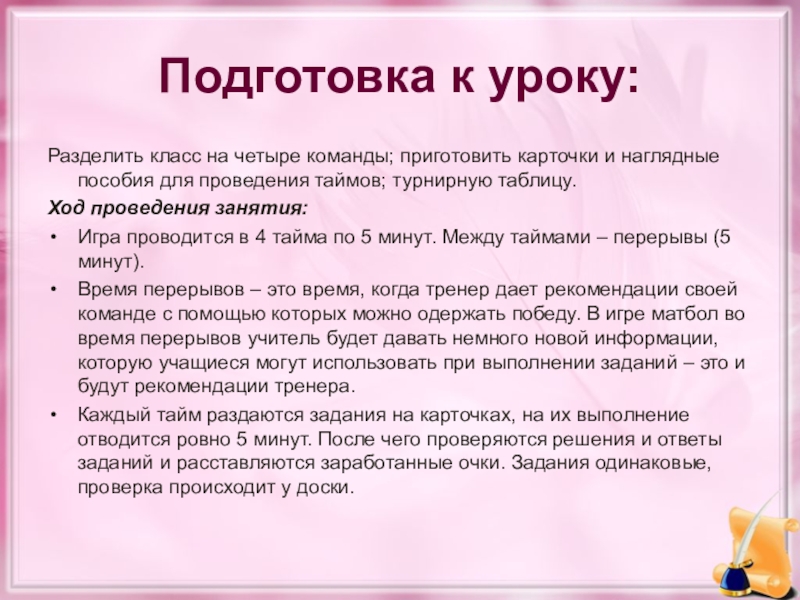 Время перерывов – это время, когда тренер дает рекомендации своей команде с помощью которых можно одержать победу. В игре матбол во время перерывов учитель будет давать немного новой информации, которую учащиеся могут использовать при выполнении заданий – это и будут рекомендации тренера.