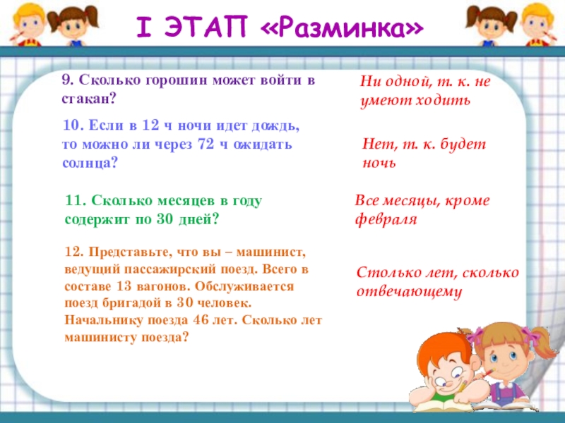 12. Представьте, что вы – машинист, ведущий пассажирский поезд. Всего в составе 13 вагонов. Обслуживается поезд бригадой в 30 человек. Начальнику поезда 46 лет. Сколько лет машинисту поезда?