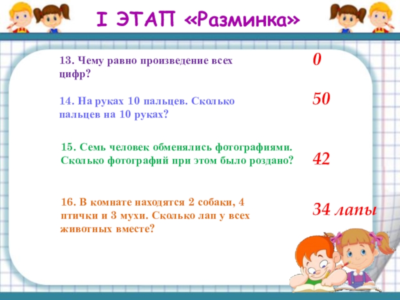 16. В комнате находятся 2 собаки, 4 птички и 3 мухи. Сколько лап у всех животных вместе?