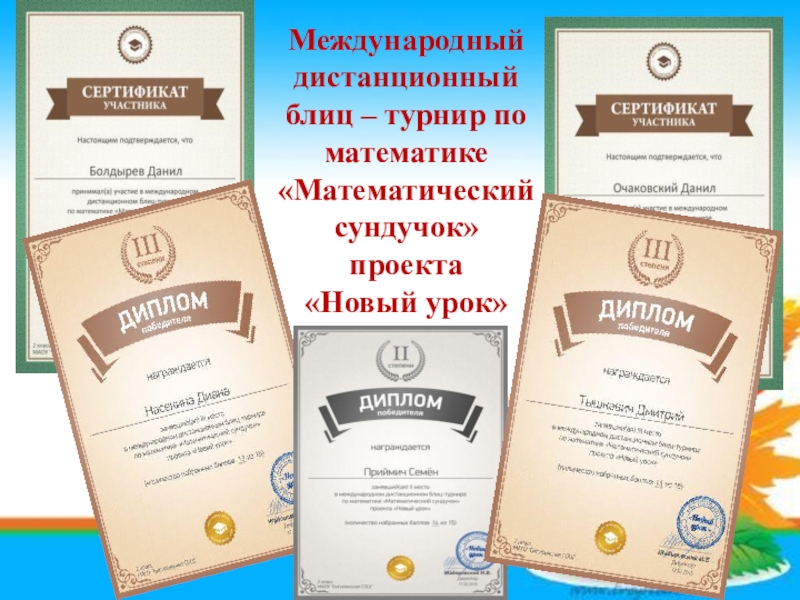 Слайд 16Международный дистанционный блиц – турнир по математике «Математический сундучок» проекта