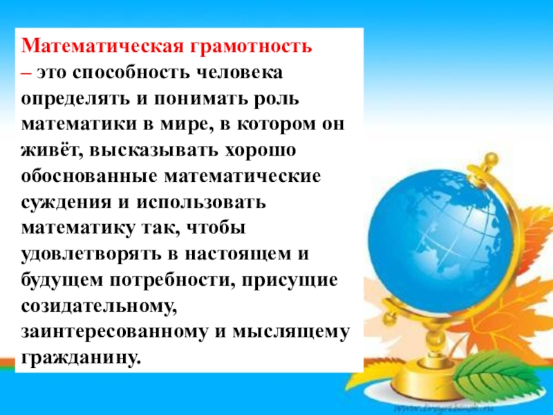 Математическая грамотность – это способность человека определять и понимать роль математики в мире, в котором он живёт, высказывать хорошо обоснованные математические суждения и использовать математику так, чтобы удовлетворять в настоящем и будущем потребности, присущие созидательному, заинтересованному и