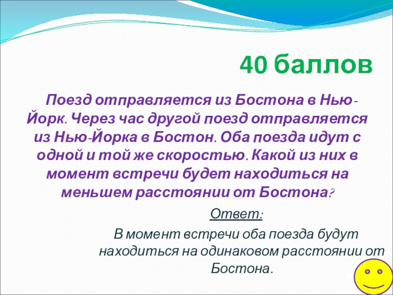 В момент встречи оба поезда будут находиться на одинаковом расстоянии от Бостона.