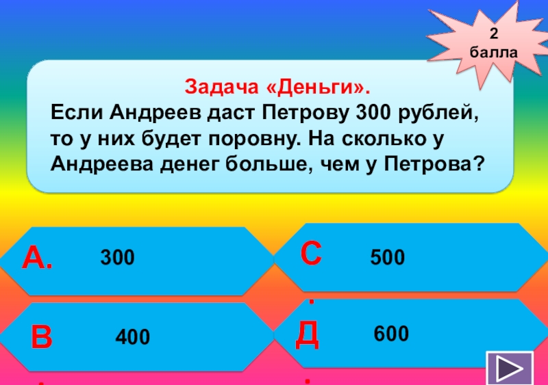 Если Андреев даст Петрову 300 рублей, то у них будет поровну. На сколько у