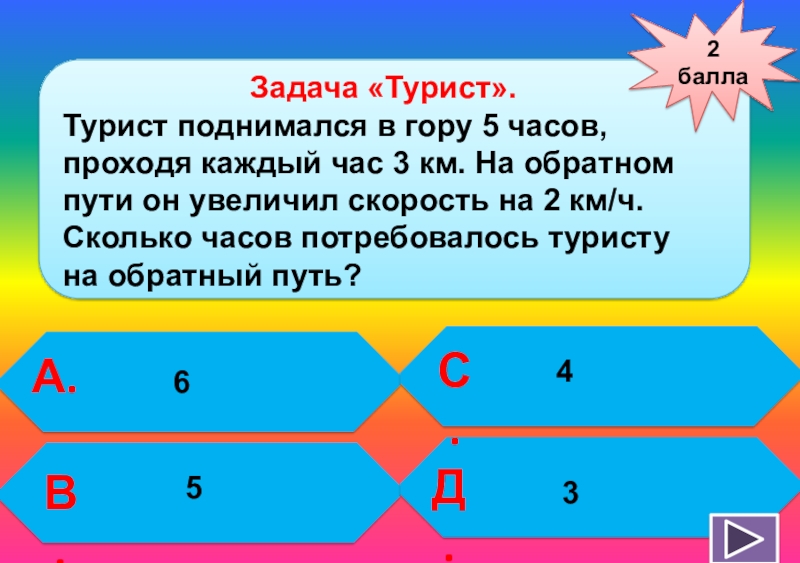 Турист поднимался в гору 5 часов, проходя каждый час 3 км. На обратном пути он увеличил скорость на 2 км/ч. Сколько часов потребовалось туристу на обратный путь?