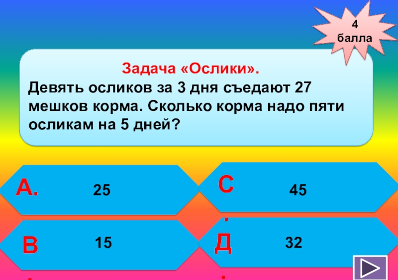 Девять осликов за 3 дня съедают 27 мешков корма. Сколько корма надо пяти осликам на 5 дней?