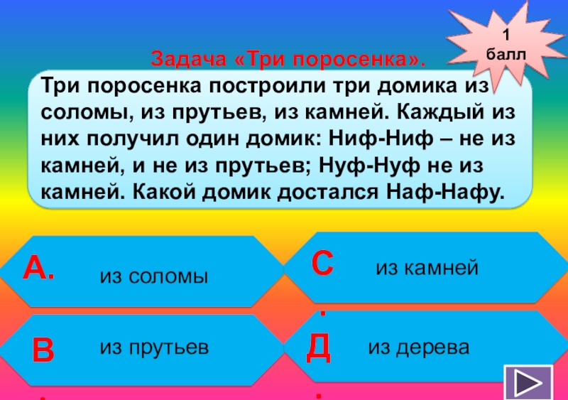 Три поросенка построили три домика из соломы, из прутьев, из камней. Каждый из них получил один домик: Ниф-Ниф – не из камней, и не из прутьев; Нуф-Нуф не из камней. Какой домик достался Наф-Нафу.