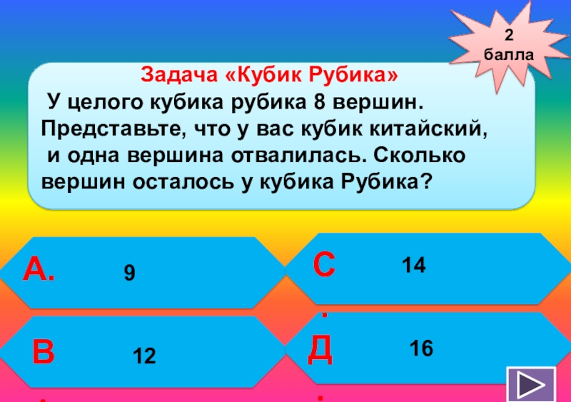 У целого кубика рубика 8 вершин. Представьте, что у вас кубик китайский,