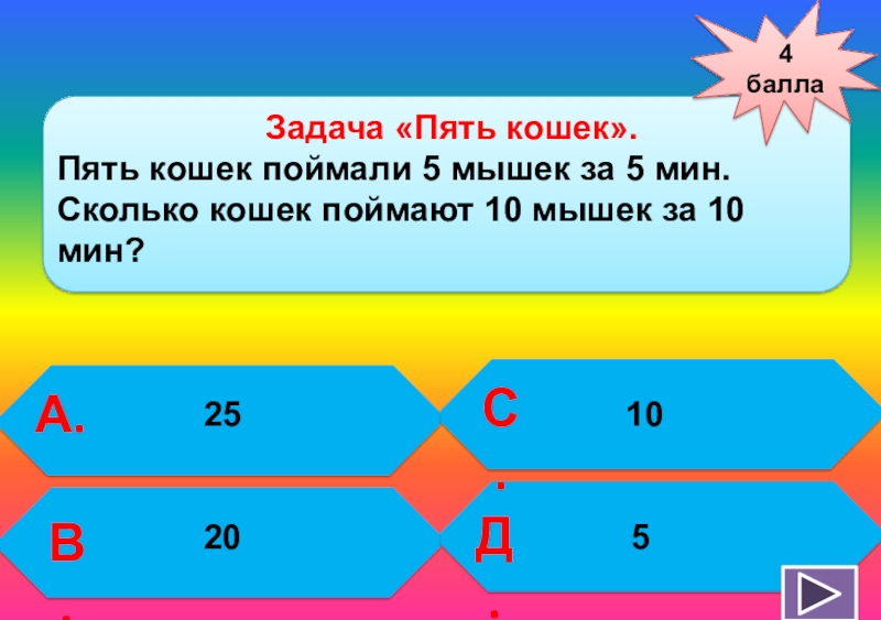 Пять кошек поймали 5 мышек за 5 мин. Сколько кошек поймают 10 мышек за 10 мин?