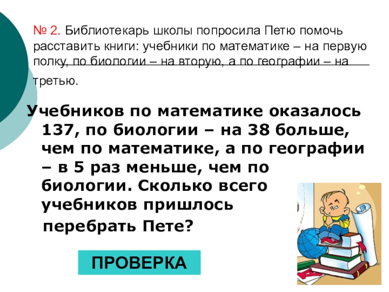 Учебников по математике оказалось 137, по биологии – на 38 больше, чем по математике, а по географии – в 5 раз меньше, чем по биологии. Сколько всего учебников пришлось