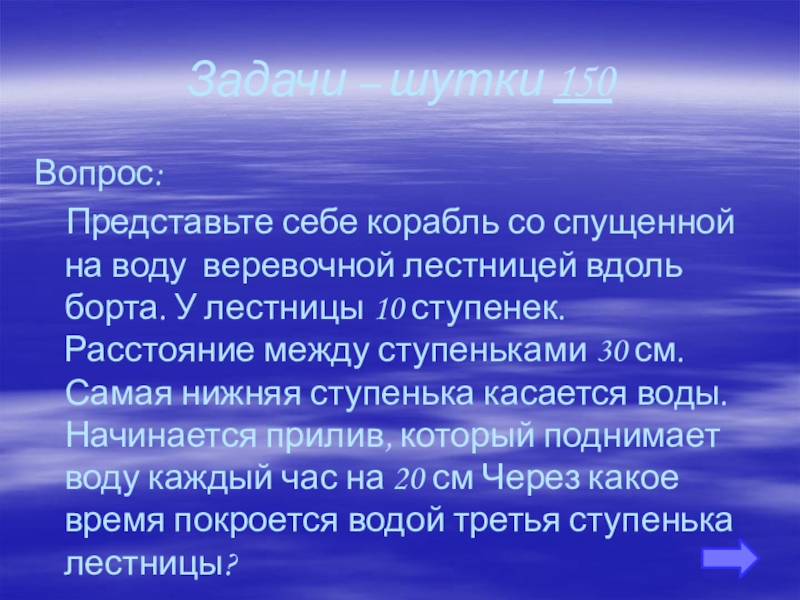 воду веревочной лестницей вдоль борта. У лестницы 10 ступенек. Расстояние между ступеньками 30 см. Самая нижняя ступенька касается воды. Начинается прилив, который поднимает воду каждый час на 20 см Через какое время покроется водой третья ступенька лестницы?