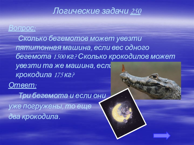 одного бегемота 1500 кг? Сколько крокодилов может увезти та же машина, если вес одного крокодила 175 кг?