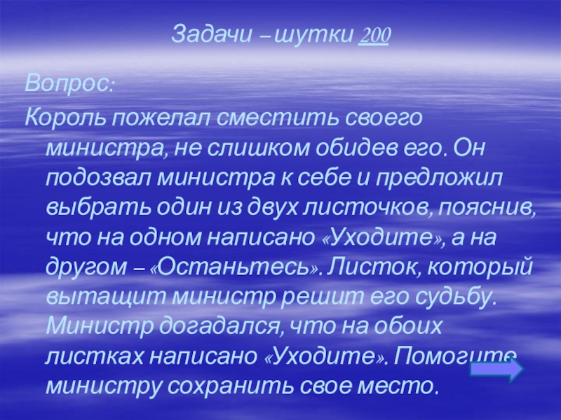 его. Он подозвал министра к себе и предложил выбрать один из двух листочков, пояснив, что на одном написано «Уходите», а на другом – «Останьтесь». Листок, который вытащит министр решит его судьбу. Министр догадался, что на обоих листках написано «Уходите». Помогите министру сохранить свое место.