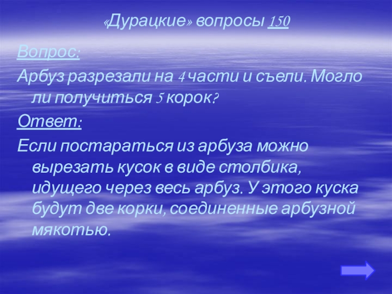 Если постараться из арбуза можно вырезать кусок в виде столбика, идущего через весь арбуз. У этого куска будут две корки, соединенные арбузной мякотью.
