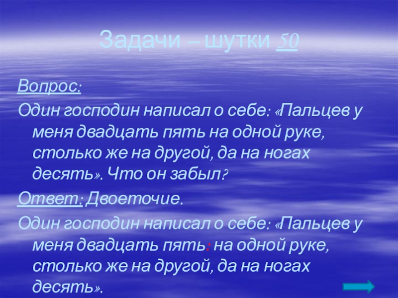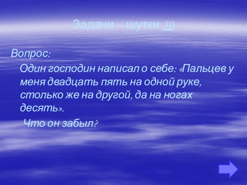 двадцать пять на одной руке, столько же на другой, да на ногах десять». Что он забыл?