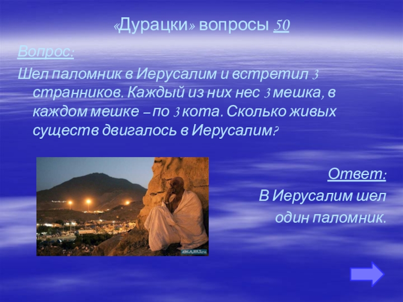 из них нес 3 мешка, в каждом мешке – по 3 кота. Сколько живых существ двигалось в Иерусалим?
