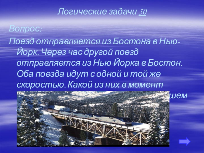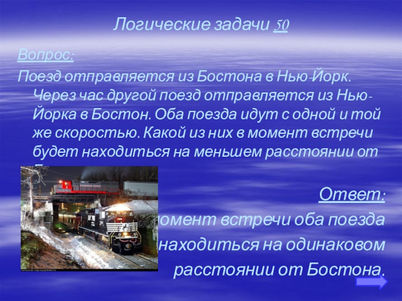 поезд отправляется из Нью-Йорка в Бостон. Оба поезда идут с одной и той же скоростью. Какой из них в момент встречи будет находиться на меньшем расстоянии от Бостона?