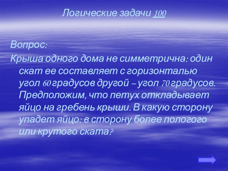 с горизонталью угол 60 градусов другой – угол 70 градусов. Предположим, что петух откладывает яйцо на гребень крыши. В какую сторону упадет яйцо: в сторону более пологого или крутого ската?