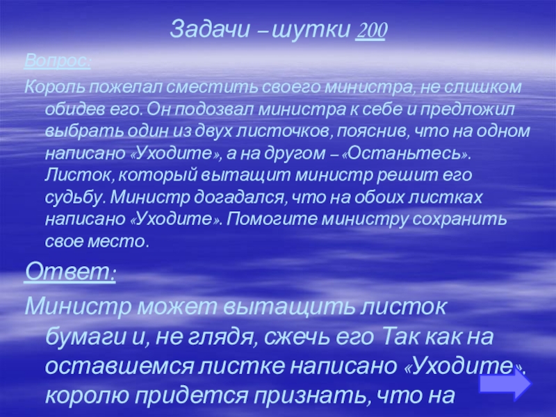 Министр может вытащить листок бумаги и, не глядя, сжечь его Так как на оставшемся листке написано «Уходите», королю придется признать, что на уничтоженном листке значилось «Останьтесь».