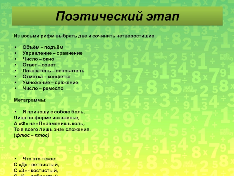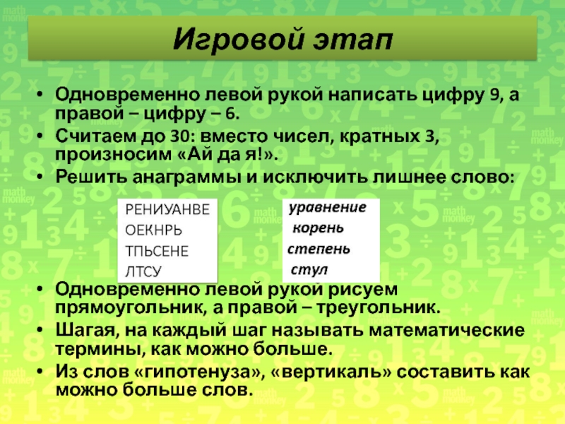 Шагая, на каждый шаг называть математические термины, как можно больше.