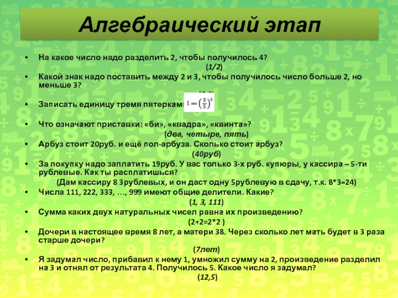 За покупку надо заплатить 19руб. У вас только 3-х руб. купюры, у кассира – 5-ти рублевые. Как ты расплатишься?