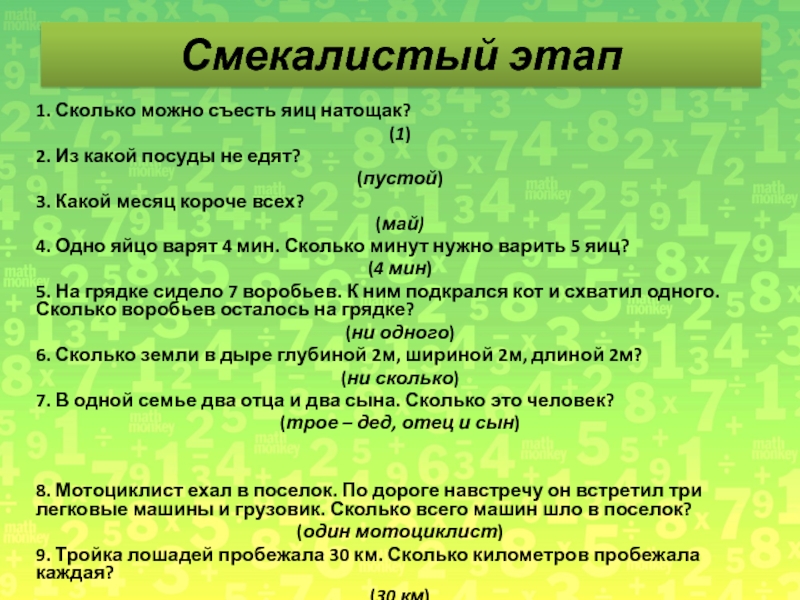 9. Тройка лошадей пробежала 30 км. Сколько километров пробежала каждая?
