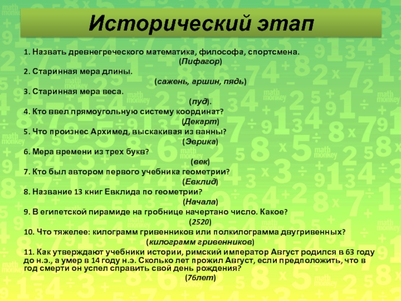 1. Назвать древнегреческого математика, философа, спортсмена.