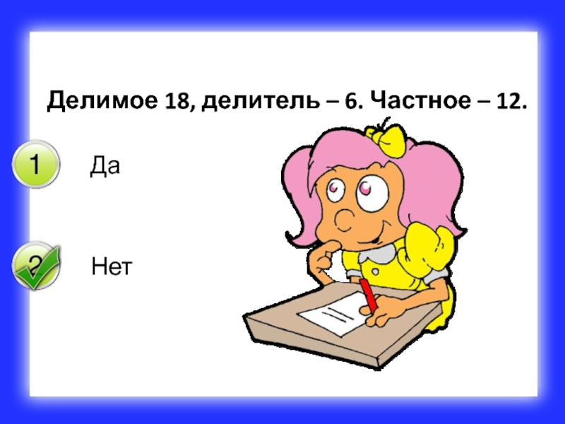 Слайд 8Делимое 18, делитель – 6. Частное – 12.