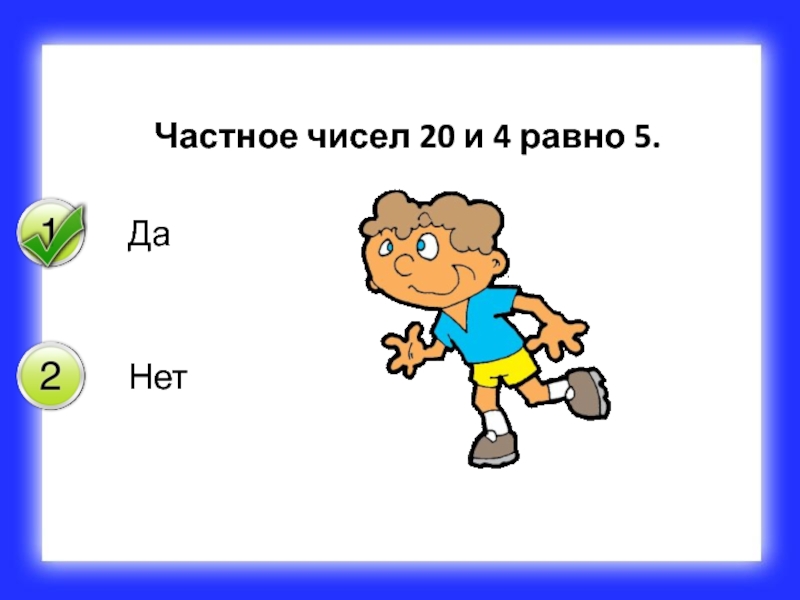 Слайд 11Частное чисел 20 и 4 равно 5.