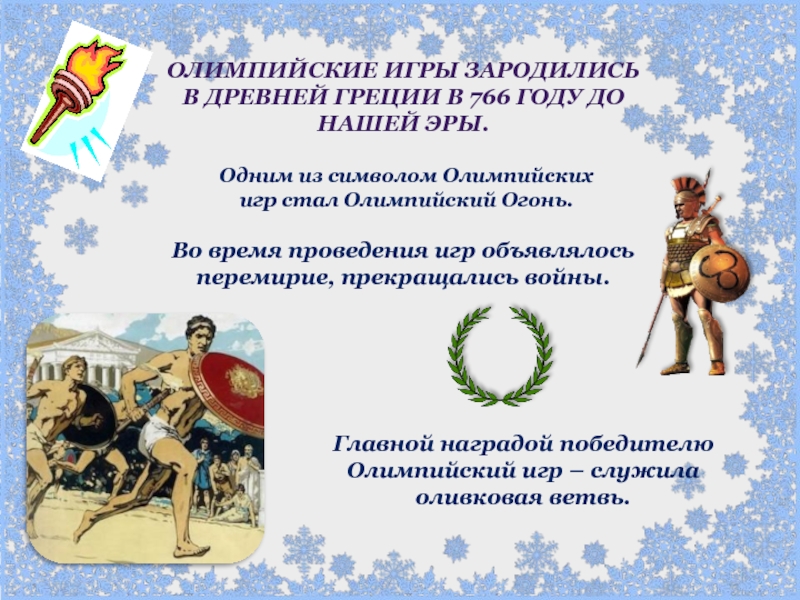 ОЛИМПИЙСКИЕ ИГРЫ ЗАРОДИЛИСЬ В ДРЕВНЕЙ ГРЕЦИИ В 766 ГОДУ ДО НАШЕЙ ЭРЫ.