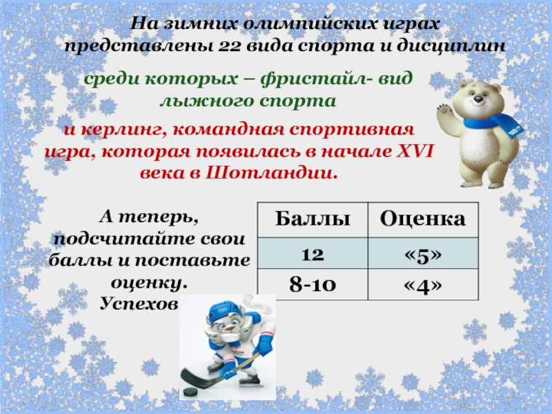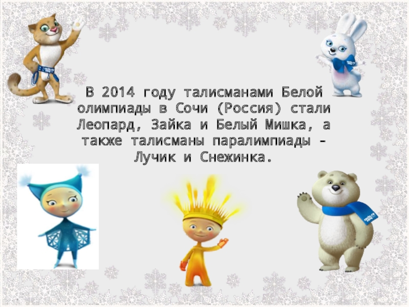 Талисманами Белой олимпиады в Сочи стали Леопард, Зайка и Белый Мишка, а также Лучик и Снежинка.